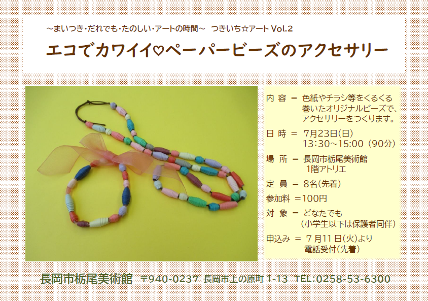 つきいち☆アートVOL.2のお知らせです。「中原淳一展 -美しく装うことの大切さ-」開催に合わせて、身近な材料でアートを楽しむワークショップの第1弾です。第2弾として、8月27日「ダンボール織りでアート」、第3弾は、9月24日「おしゃれなBOXづくり」を順次開催していきます。どうぞお楽しみに!