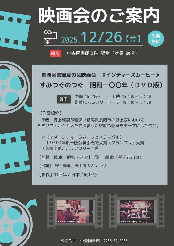 長岡図書館友の会 映画会のご案内 投稿日時 : 9:25 図書館管理者 12月26日(金)午後3時30分より、友の会会長 監督・製作作品『すみつぐのつぐ 昭和一〇〇年(DVD版)』を上映します! 申し込みは不要、直接会場へお越しください。 ※開場 午後3時10分~
