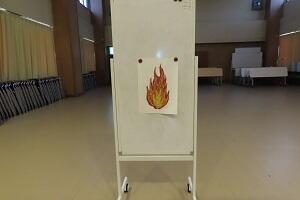 Sが講座室からお客さん役の職員を避難誘導、そのあと職員全員で消火器の置いてある場所を確認して、KHとSが消火器を出火場所の講座室へ運び初期消火!!