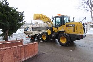 積もった雪を大きなシャベルで上手にすくってトラックに載せます。