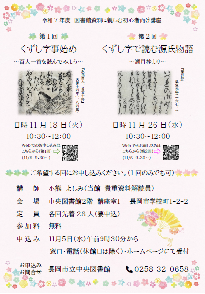 中央図書館では、今年も図書館資料に親しむ初心者向けのくずし字講座を開催します。今年度は2回開催します! ご希望する回にお申し込み下さい。