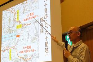 福島県の重要文化財に指定されている「長谷部大作家文書」をテキストに、「八十里越」にまつわる資料3点を読みました。「この道の一里が平地の十里にも匹敵するほど険しかった」という峠道。講師が用意した映像を見ながらていねいな解説を聞き、行き来する人びとのすがたに思いをはせました。