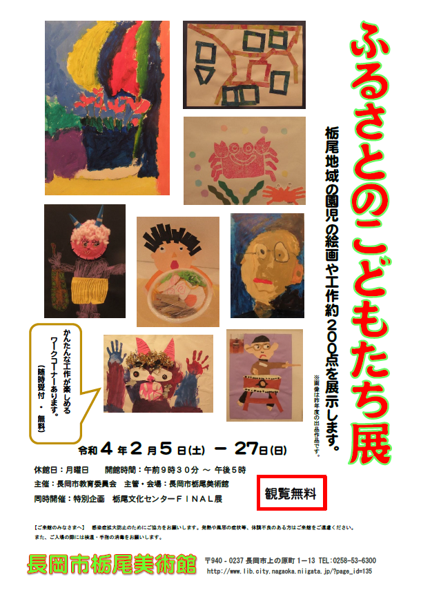 栃尾地域の園児が1年間の活動を通して制作した絵画や工作を展示します。